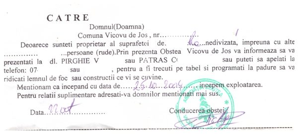 Trebuie spus că în primii ani, exploatarea lemnului se făcea de persoane fizice. După ce primea înștiințarea de la Președinte (vezi imaginea de mai jos, care prezintă un model de înștiințare, valabil în acea perioadă), orice membru al Obștii care ar fi dorit, putea merge în pădure și își lua lemnul cuvenit, după ce, în prealabil, lua legătura cu președintele Obștii și era trecut într-un tabel.