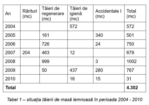 Deși se putea exploata o cantitate de aproximativ 1.500 – 1.600 mc masă lemnoasă în fiecare an (conform prevederilor amenajamentului silvic), după cum putem constata din informațiile prezentate în tabelul 1, în perioada 2004 – 2010 s-a exploatat, în medie, aproximativ 615 mc/an, ceea ce înseamnă un procent cuprins între 38% – 41% din volumul total de lemn ce putea fi marcat și exploatat. Aceasta explică și volumul foarte mare de lemn care a putut fi exploatat în perioadele de timp următoare, începând cu anul 2011 (vezi tabelele 2 și 6).