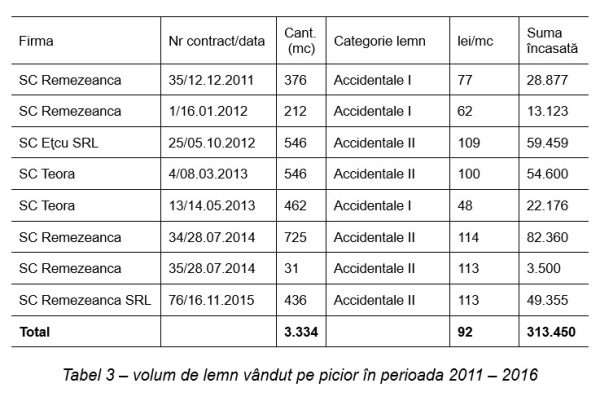2.2.2 Conform contractelor de vânzare-cumpărare de masă lemnoasă, în perioada 2011 – 31.05.2016 s-a vândut cantitatea de 3.334 mc lemn pe picior (vezi tabelul 3). Să mai reținem că, în această perioadă, prin două hotărâri ale Consiliului de administraţie, volumul de lemn atribuit Președintelui, a fost stabilit la 3%, respectiv 3,5% din volumul total de lemn marcat (Hotărâre nr. 71/17.10.2011 și Hotărâre nr. 35/22.04.2013, astfel, volumul total de lemn atribuit membrilor Conducerii a fost de 800 mc.